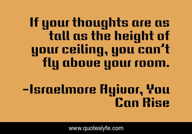 This page presents the quote "If your thoughts are as tall as the height of your ceiling, you can’t fly above your room.". Author of this quote is Israelmore Ayivor, You Can Rise. This quote is about fly, ceiling, flight, dream-big, thinking, big-dreams, flying, food-for-thought, roof,.