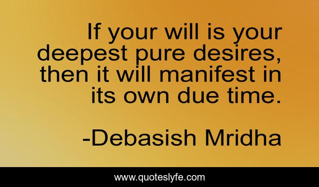 This page presents the quote "If your will is your deepest pure desires, then it will manifest in its own due time.". Author of this quote is Debasish Mridha. This quote is about desires, deepest-pure-desires, philosophy, debasish-mridha, quotes, inspirational, enthusiasm, debasish-mridha-m-d,.