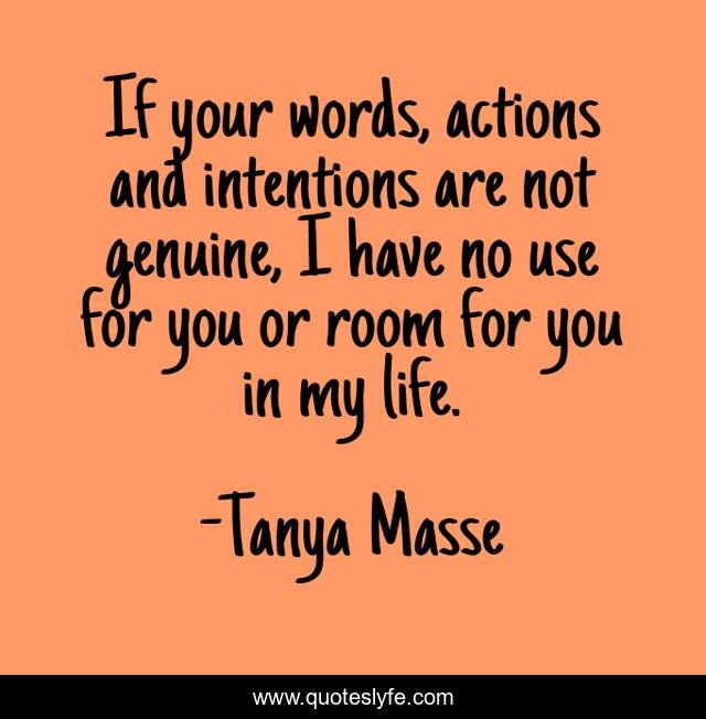 This page presents the quote "If your words, actions and intentions are not genuine, I have no use for you or room for you in my life.". Author of this quote is Tanya Masse. This quote is about quotes-to-live-by, life, quotes-about-life,.