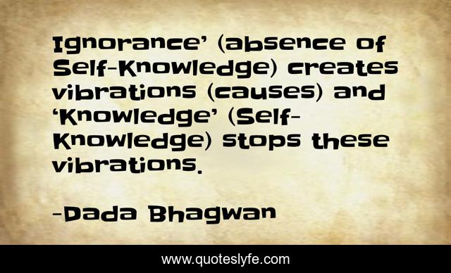 This page presents the quote "Ignorance’ (absence of Self-Knowledge) creates vibrations (causes) and ‘Knowledge’ (Self-Knowledge) stops these vibrations.". Author of this quote is Dada Bhagwan. This quote is about spiritual, knowledge, self-knowledge, ignorance, knowledge-of-the-self, effect, karma, cause,.