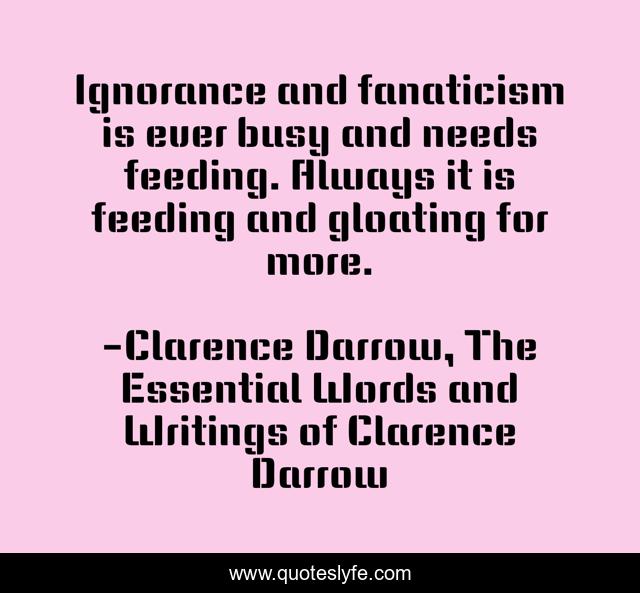 This page presents the quote "Ignorance and fanaticism is ever busy and needs feeding. Always it is feeding and gloating for more.". Author of this quote is Clarence Darrow, The Essential Words and Writings of Clarence Darrow. This quote is about fanaticismt, justice, philosophy, ignorance, bias, prejudice,.