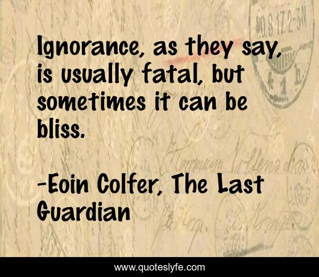 This page presents the quote "Ignorance, as they say, is usually fatal, but sometimes it can be bliss.". Author of this quote is Eoin Colfer, The Last Guardian. This quote is about ignorance, observations,.