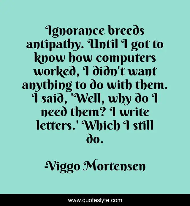 This page presents the quote "Ignorance breeds antipathy. Until I got to know how computers worked, I didn't want anything to do with them. I said, 'Well, why do I need them? I write letters.' Which I still do.". Author of this quote is Viggo Mortensen. .