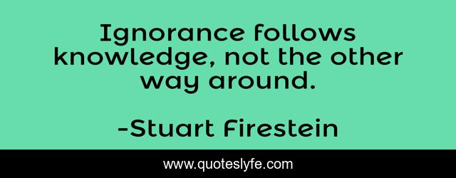 This page presents the quote "Ignorance follows knowledge, not the other way around.". Author of this quote is Stuart Firestein. This quote is about ignorance, knowledge,.