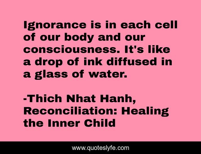 This page presents the quote "Ignorance is in each cell of our body and our consciousness. It's like a drop of ink diffused in a glass of water.". Author of this quote is Thich Nhat Hanh, Reconciliation: Healing the Inner Child. This quote is about reconciliation, peace, ignorance, consciousness,.