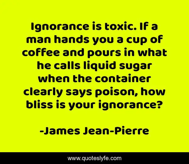 This page presents the quote "Ignorance is toxic. If a man hands you a cup of coffee and pours in what he calls liquid sugar when the container clearly says poison, how bliss is your ignorance?". Author of this quote is James Jean-Pierre. This quote is about ignorance-is-bliss, ignorance, knowledge,.