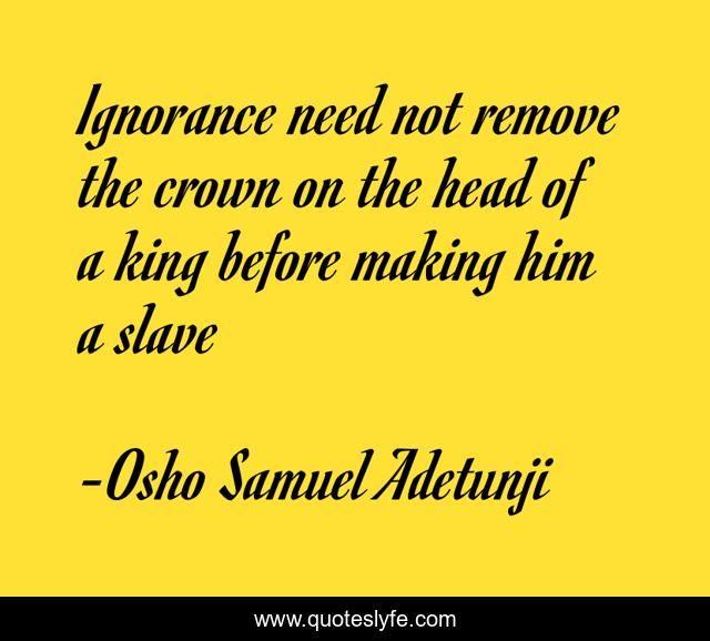 This page presents the quote "Ignorance need not remove the crown on the head of a king before making him a slave". Author of this quote is Osho Samuel Adetunji. This quote is about greatness, ignorance, royalty, knowledge, wisdom,.