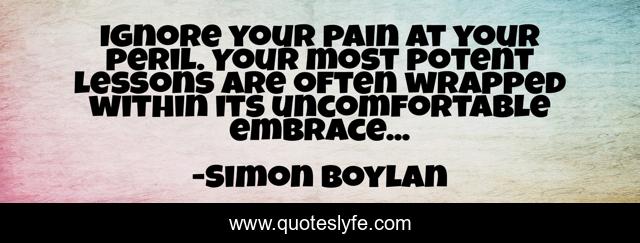 This page presents the quote "Ignore your pain at your peril. Your most potent lessons are often wrapped within its uncomfortable embrace...". Author of this quote is Simon Boylan. This quote is about lessons, truth, wisdom,.