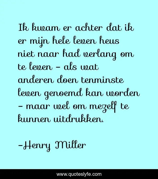 This page presents the quote "Ik kwam er achter dat ik er mijn hele leven heus niet naar had verlang om te leven - als wat anderen doen tenminste leven genoemd kan worden - maar wel om mezelf te kunnen uitdrukken.". Author of this quote is Henry Miller. This quote is about life, philosophy, tropic-of-capricorn,.