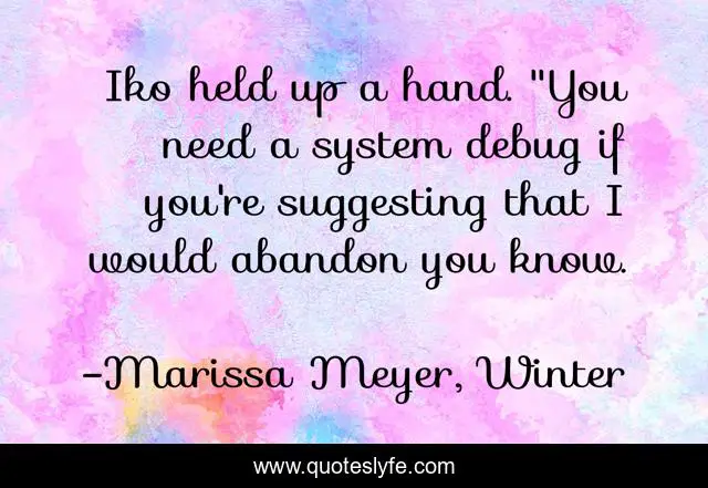 This page presents the quote "Iko held up a hand. "You need a system debug if you're suggesting that I would abandon you know.". Author of this quote is Marissa Meyer, Winter. This quote is about fun, marissa-meyer, iko, winter, the-lunar-chronicles,.