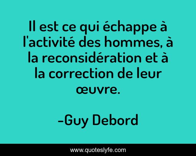 This page presents the quote "Il est ce qui échappe à l'activité des hommes, à la reconsidération et à la correction de leur œuvre.". Author of this quote is Guy Debord. This quote is about philosophy, philosophie,.