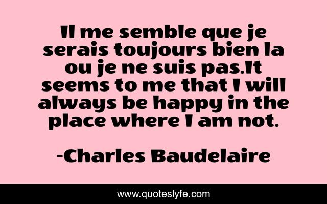 This page presents the quote "Il me semble que je serais toujours bien la ou je ne suis pas.It seems to me that I will always be happy in the place where I am not.". Author of this quote is Charles Baudelaire. This quote is about irony, happy,.