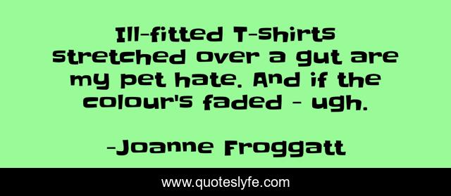 This page presents the quote "Ill-fitted T-shirts stretched over a gut are my pet hate. And if the colour's faded - ugh.". Author of this quote is Joanne Froggatt. This quote is about colour, hate, gut,.