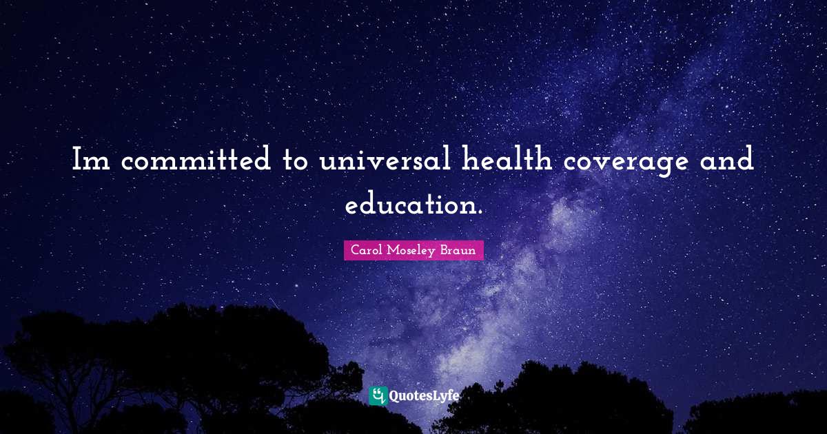 This page presents the quote "Im committed to universal health coverage and education.". Author of this quote is Carol Moseley Braun. This quote is about universal, education, coverage, committed, universal education, health,.