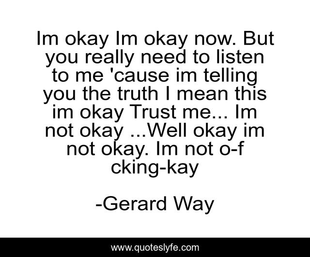 This page presents the quote "Im okay Im okay now. But you really need to listen to me 'cause im telling you the truth I mean this im okay Trust me... Im not okay ...Well okay im not okay. Im not o-f cking-kay". Author of this quote is Gerard Way. This quote is about emo, sad, im-not-okay, music, trust-me, my-chemical-romance, alternative, mcr,.