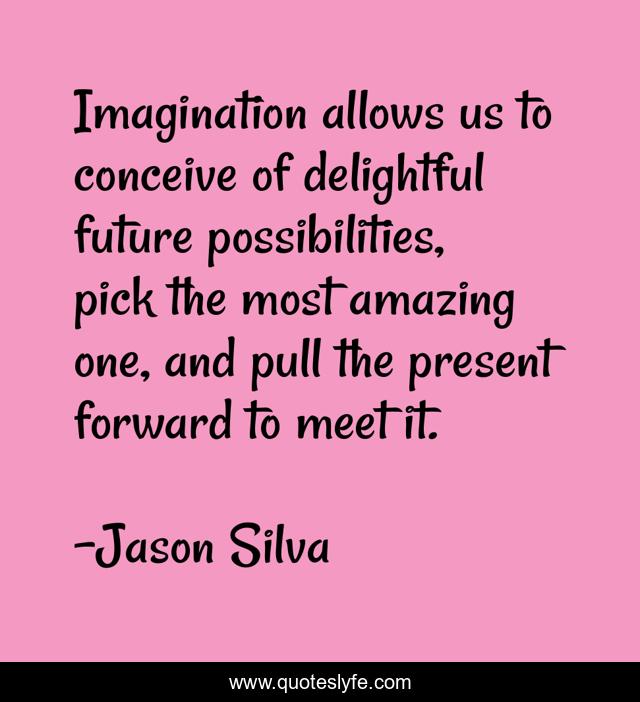 This page presents the quote "Imagination allows us to conceive of delightful future possibilities, pick the most amazing one, and pull the present forward to meet it.". Author of this quote is Jason Silva. This quote is about imagination, future,.