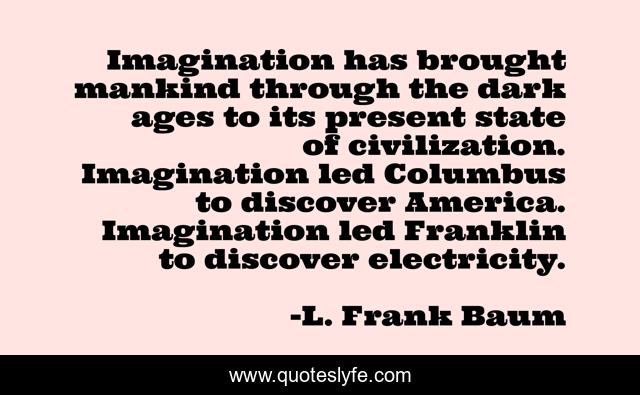 This page presents the quote "Imagination has brought mankind through the dark ages to its present state of civilization. Imagination led Columbus to discover America. Imagination led Franklin to discover electricity.". Author of this quote is L. Frank Baum. This quote is about dark, america, present,.