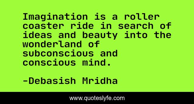 This page presents the quote "Imagination is a roller coaster ride in search of ideas and beauty into the wonderland of subconscious and conscious mind.". Author of this quote is Debasish Mridha. This quote is about beauty, imagination, subconscious-mind, philosophy, debasish-mridha, ideas, conscious-mind, quotes, inspirational,.
