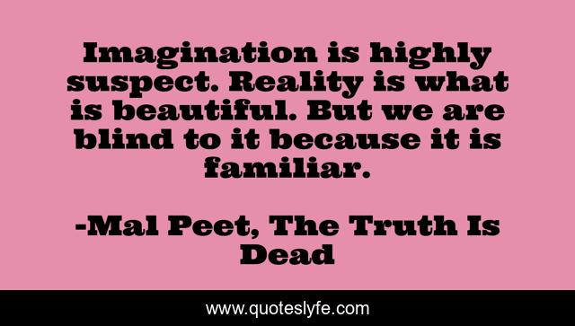 This page presents the quote "Imagination is highly suspect. Reality is what is beautiful. But we are blind to it because it is familiar.". Author of this quote is Mal Peet, The Truth Is Dead. This quote is about the-truth-is-dead, historical, fiction,.