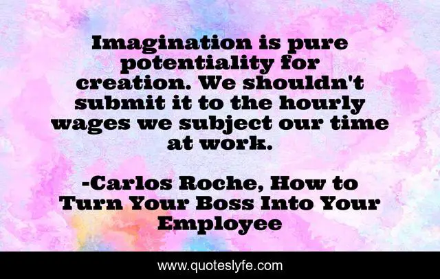 This page presents the quote "Imagination is pure potentiality for creation. We shouldn't submit it to the hourly wages we subject our time at work.". Author of this quote is Carlos Roche, How to Turn Your Boss Into Your Employee. This quote is about salary, work, career, hourly-wages, boss, imagination, job, employment,.