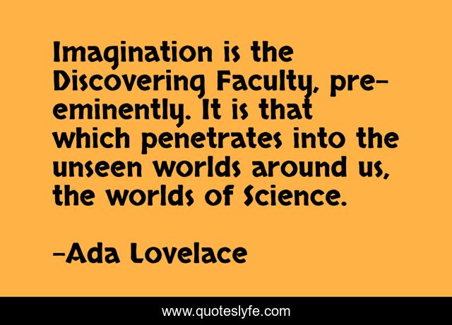 This page presents the quote "Imagination is the Discovering Faculty, pre-eminently. It is that which penetrates into the unseen worlds around us, the worlds of Science.". Author of this quote is Ada Lovelace. This quote is about imagination, us, which,.