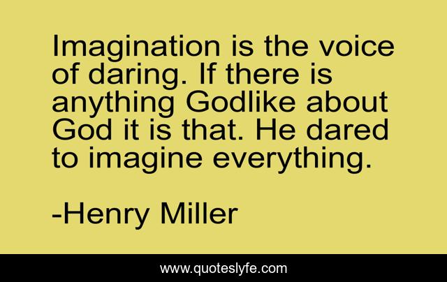 This page presents the quote "Imagination is the voice of daring. If there is anything Godlike about God it is that. He dared to imagine everything.". Author of this quote is Henry Miller. This quote is about god, voice, anything,.
