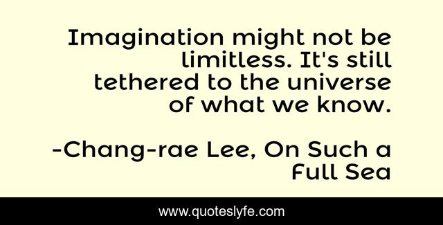 This page presents the quote "Imagination might not be limitless. It's still tethered to the universe of what we know.". Author of this quote is Chang-rae Lee, On Such a Full Sea. This quote is about thought, imagination,.