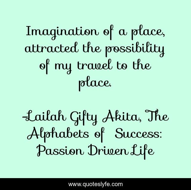 "Lailah Gifty Akita, The Alphabets of Success: Passion Driven Life Quotes." Quoteslyfe.com, 2025. Sat. 06 Dec. 2025. <https://www.quoteslyfe.com/quote/Imagination-of-a-place-attracted-the-possibility-126240>.