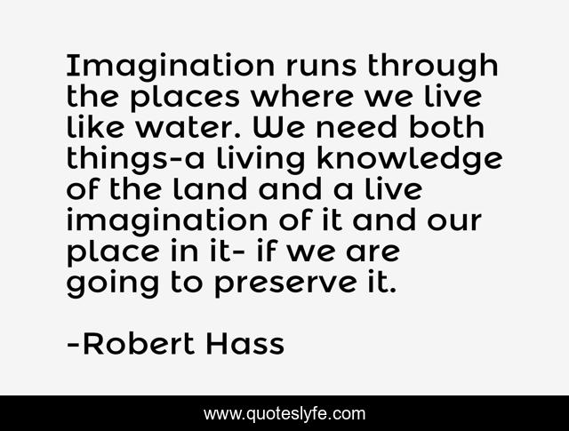 This page presents the quote "Imagination runs through the places where we live like water. We need both things-a living knowledge of the land and a live imagination of it and our place in it- if we are going to preserve it.". Author of this quote is Robert Hass. .