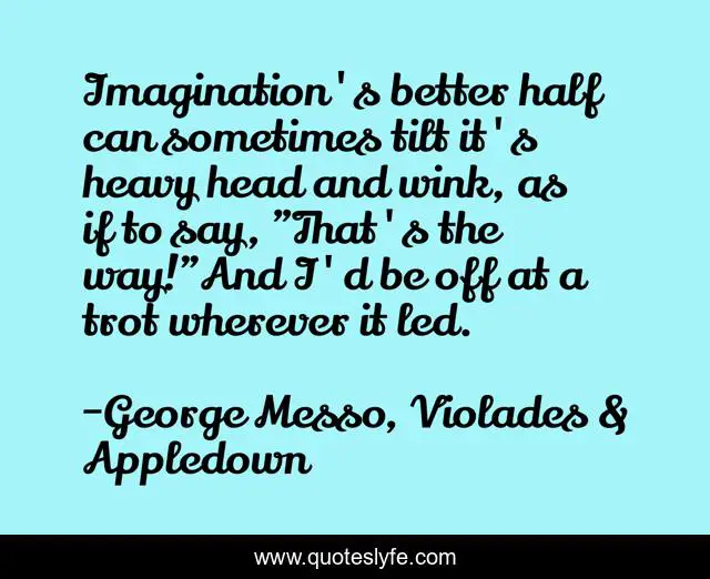 This page presents the quote "Imagination's better half can sometimes tilt it's heavy head and wink, as if to say, "That's the way!"And I'd be off at a trot wherever it led.". Author of this quote is George Messo, Violades & Appledown. This quote is about imagination, poetry, impetuousness,.