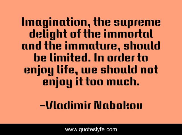 This page presents the quote "Imagination, the supreme delight of the immortal and the immature, should be limited. In order to enjoy life, we should not enjoy it too much.". Author of this quote is Vladimir Nabokov. This quote is about enjoy, life, enjoy life,.