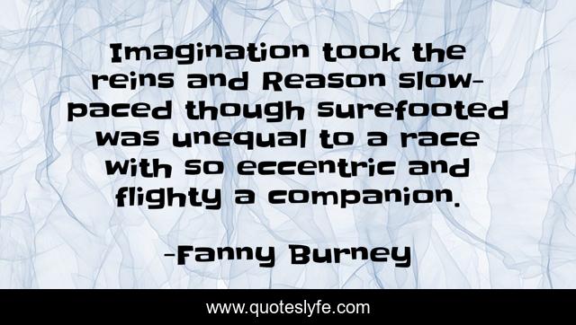 This page presents the quote "Imagination took the reins and Reason slow-paced though surefooted was unequal to a race with so eccentric and flighty a companion.". Author of this quote is Fanny Burney. .