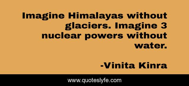 This page presents the quote "Imagine Himalayas without glaciers. Imagine 3 nuclear powers without water.". Author of this quote is Vinita Kinra. This quote is about enthusiasm, inspirational,.