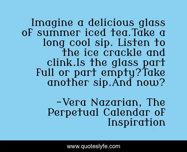 This page presents the quote "Imagine a delicious glass of summer iced tea.Take a long cool sip. Listen to the ice crackle and clink.Is the glass part full or part empty?Take another sip.And now?". Author of this quote is Vera Nazarian, The Perpetual Calendar of Inspiration. This quote is about summer, full, mood, iced, tea, half, drink, half-full, hot,.