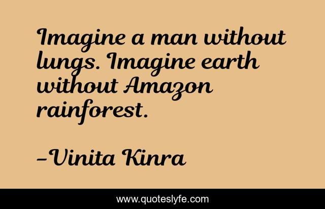 This page presents the quote "Imagine a man without lungs. Imagine earth without Amazon rainforest.". Author of this quote is Vinita Kinra. This quote is about environment, enthusiasm, inspirational, rainforest,.