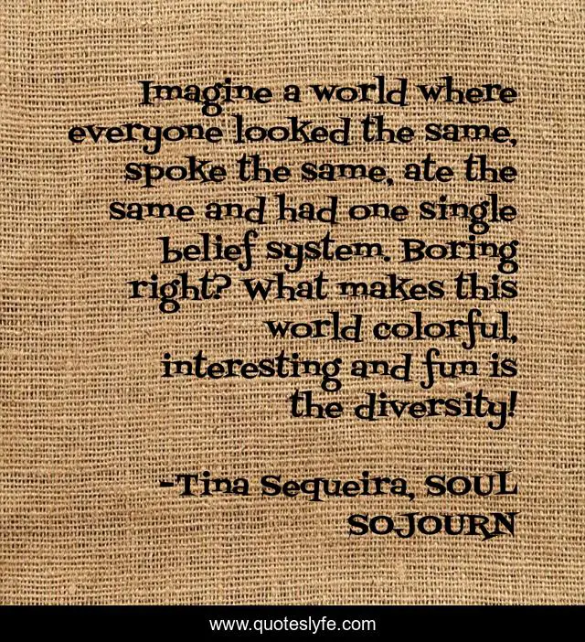 This page presents the quote "Imagine a world where everyone looked the same, spoke the same, ate the same and had one single belief system. Boring right? What makes this world colorful, interesting and fun is the diversity!". Author of this quote is Tina Sequeira, SOUL SOJOURN. .