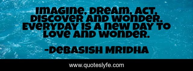 This page presents the quote "Imagine, dream, act, discover and wonder. Everyday is a new day to love and wonder.". Author of this quote is Debasish Mridha. This quote is about life, love, knowledge, inspirational, intelligence, philosophy, wisdom, quotes, affection,.