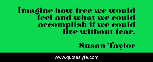 This page presents the quote "Imagine how free we would feel and what we could accomplish if we could live without fear.". Author of this quote is Susan Taylor. This quote is about fearlessness, fear, courage, life,.