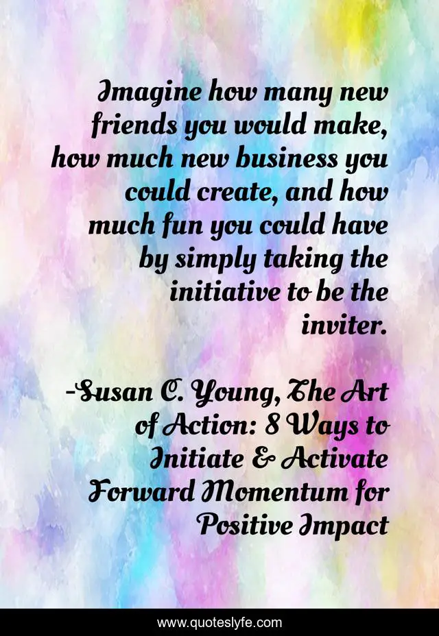 This page presents the quote "Imagine how many new friends you would make, how much new business you could create, and how much fun you could have by simply taking the initiative to be the inviter.". Author of this quote is Susan C. Young, The Art of Action: 8 Ways to Initiate & Activate Forward Momentum for Positive Impact. This quote is about relationship, customer-service, communication-skills, positive-first-impression, quotes-by-susan-c-young, initiative, selling-success, motivational-speaker-susan-young, susanspeaks-com,.