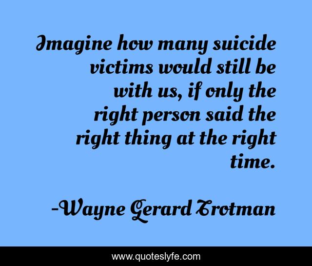 This page presents the quote "Imagine how many suicide victims would still be with us, if only the right person said the right thing at the right time.". Author of this quote is Wayne Gerard Trotman. This quote is about suicide, understanding-oneself-and-others, understanding-others, support, mental-health, words-have-power, understanding-life,.