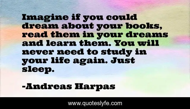 This page presents the quote "Imagine if you could dream about your books, read them in your dreams and learn them. You will never need to study in your life again. Just sleep.". Author of this quote is Andreas Harpas. This quote is about study, dreaming-in-your-sleep, science-fiction, fantasy, books, reading, dreams,.