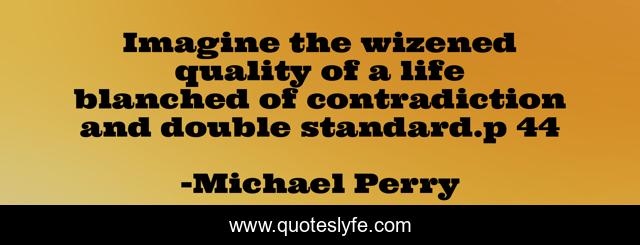 This page presents the quote "Imagine the wizened quality of a life blanched of contradiction and double standard.p 44". Author of this quote is Michael Perry. .