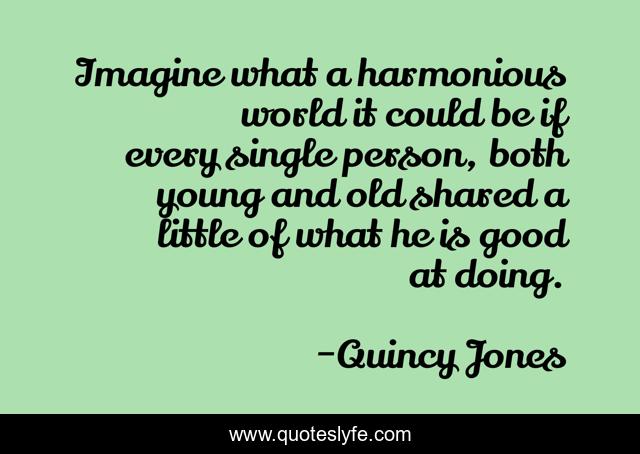 This page presents the quote "Imagine what a harmonious world it could be if every single person, both young and old shared a little of what he is good at doing.". Author of this quote is Quincy Jones. This quote is about world, good,.
