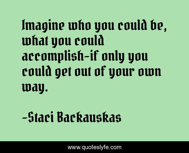 This page presents the quote "Imagine who you could be, what you could accomplish-if only you could get out of your own way.". Author of this quote is Staci Backauskas. This quote is about personal-development, enthusiasm, personal-development-insights, inspirational, self-help,.