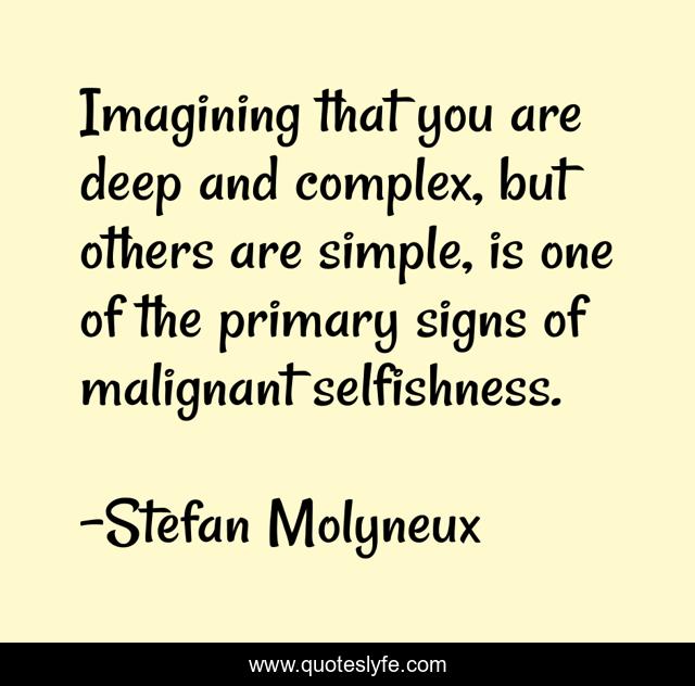 This page presents the quote "Imagining that you are deep and complex, but others are simple, is one of the primary signs of malignant selfishness.". Author of this quote is Stefan Molyneux. This quote is about narcissism, bpd, borderline, philosophy, personality-disorders, abuse, psychology,.