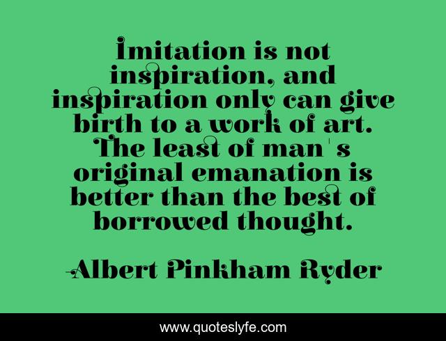 This page presents the quote "Imitation is not inspiration, and inspiration only can give birth to a work of art. The least of man's original emanation is better than the best of borrowed thought.". Author of this quote is Albert Pinkham Ryder. This quote is about emanation, art, imitation, inspiration,.