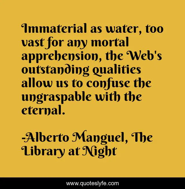 This page presents the quote "Immaterial as water, too vast for any mortal apprehension, the Web's outstanding qualities allow us to confuse the ungraspable with the eternal.". Author of this quote is Alberto Manguel, The Library at Night. This quote is about computers, internet,.