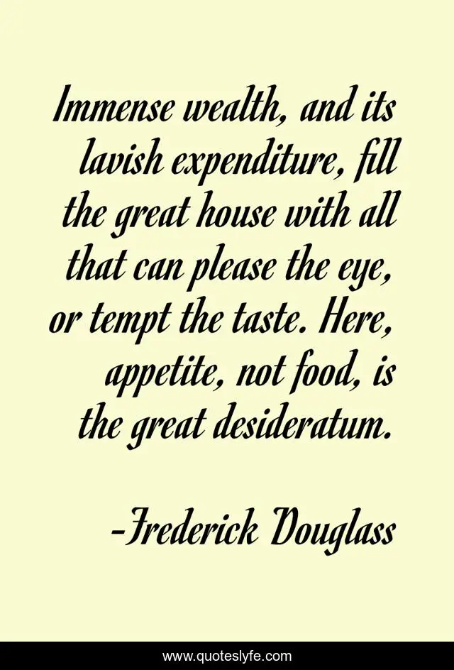 This page presents the quote "Immense wealth, and its lavish expenditure, fill the great house with all that can please the eye, or tempt the taste. Here, appetite, not food, is the great desideratum.". Author of this quote is Frederick Douglass. This quote is about desire, material, greed, nourishment,.