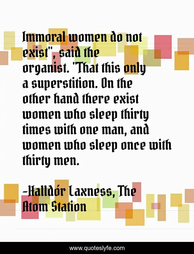 This page presents the quote "Immoral women do not exist", said the organist. "That this only a superstition. On the other hand there exist women who sleep thirty times with one man, and women who sleep once with thirty men.". Author of this quote is Halldór Laxness, The Atom Station. This quote is about icelandic, feminism, women,.