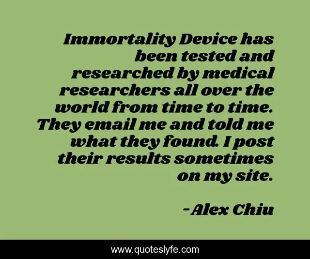 This page presents the quote "Immortality Device has been tested and researched by medical researchers all over the world from time to time. They email me and told me what they found. I post their results sometimes on my site.". Author of this quote is Alex Chiu. This quote is about me, world, time,.